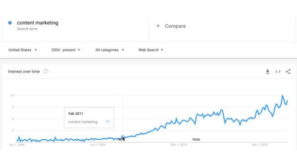 Danny Goodwin ve svém článku „Lookback: Google launched the Panda algorithm update 11 years ago", z něhož čerpáme většinu zde uveřejněných informací, říká, že pojem „obsahový marketing" před Pandou vlastně neexistoval. Stačí se podívat do Google Trends (viz obrázek níže) a zjistíte, kdy o tento termín začal být zájem. Samotný termín sice pochází z roku 1996, ale obsahový marketing jako samostatná disciplína se zrodil až v důsledku Pandy.